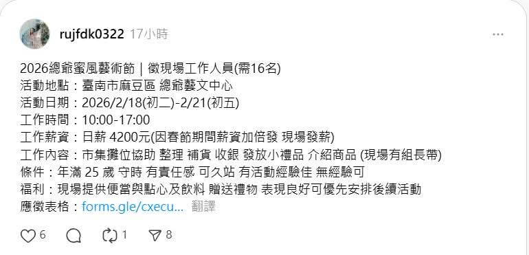 近日於 Threads 平台發現有冒用「蜜風藝術節」名義之徵才貼文。